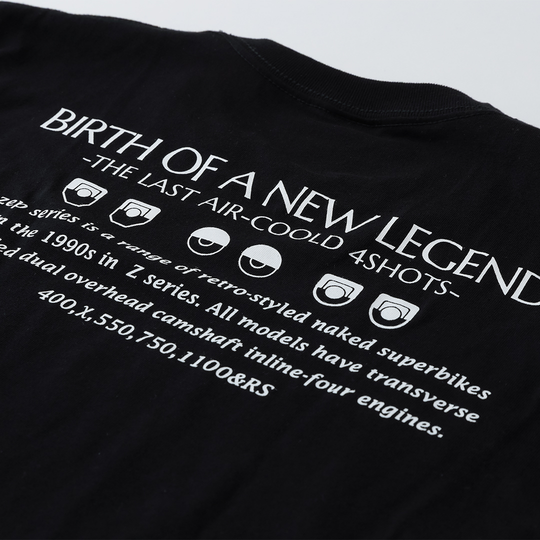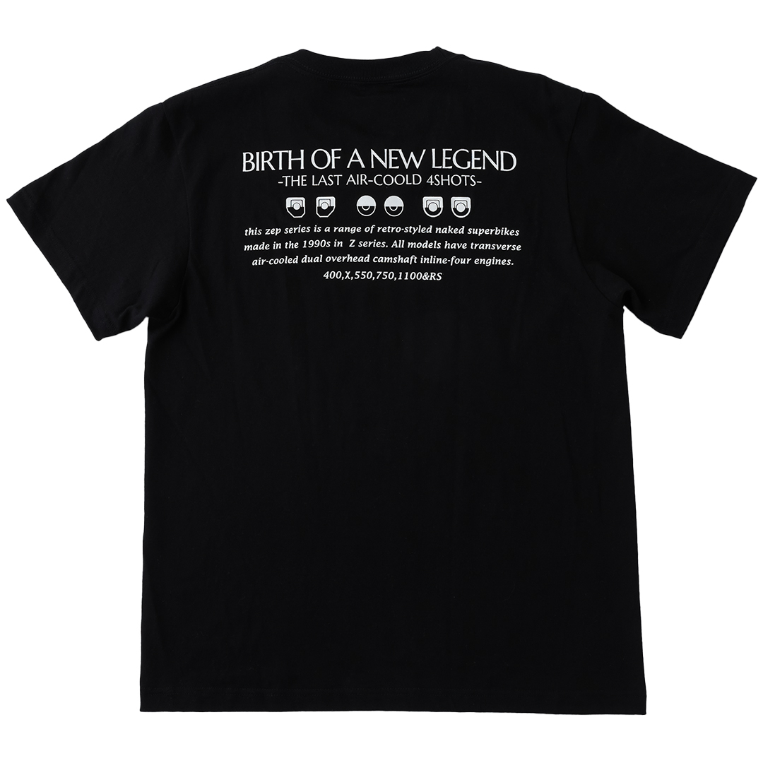 『BIRTH OF A NEW LEGEND』とは『新たな伝説の誕生』の意。その下には最後の空冷であるゼファー全シリーズのエンジンヘッドカバーデザインをあしらいました。