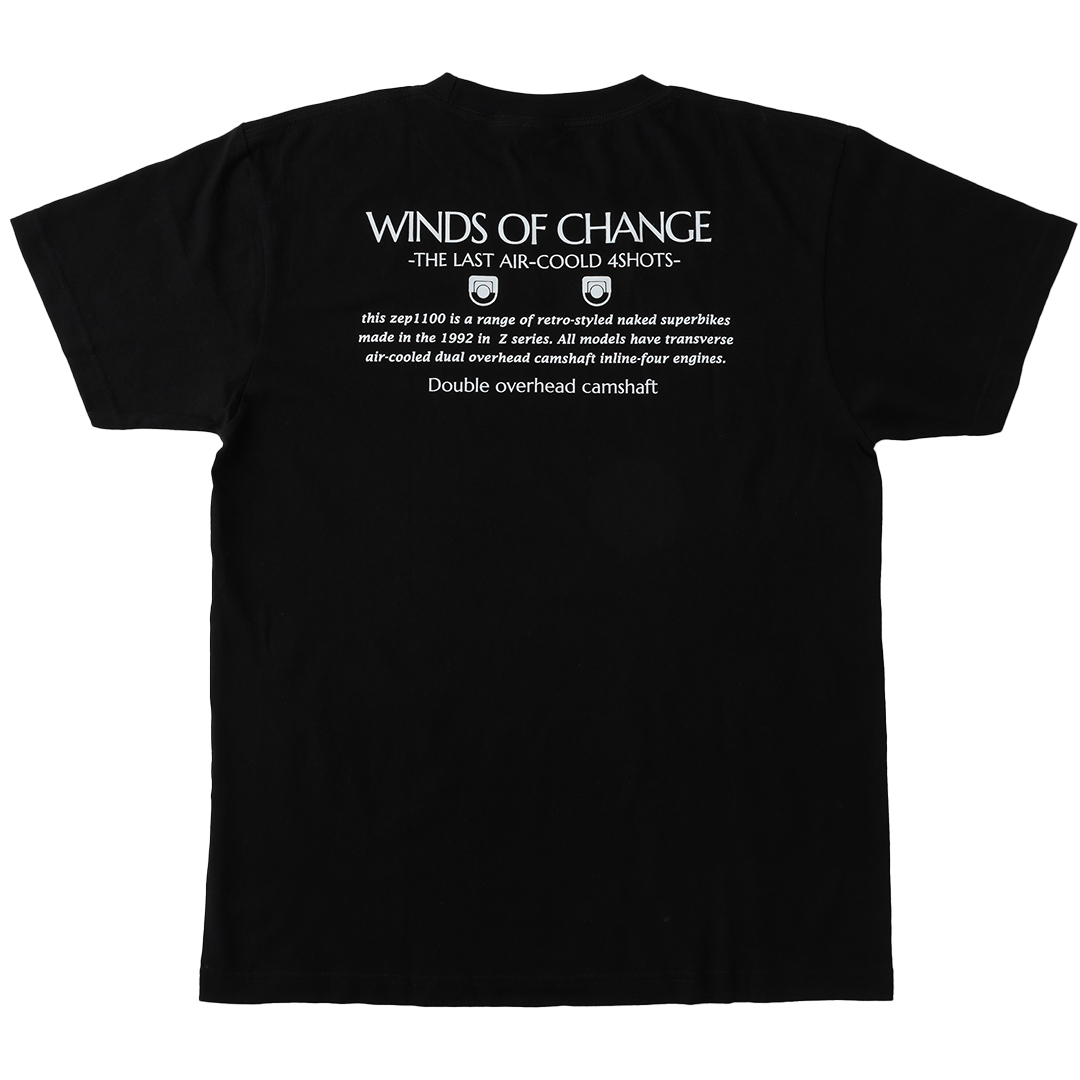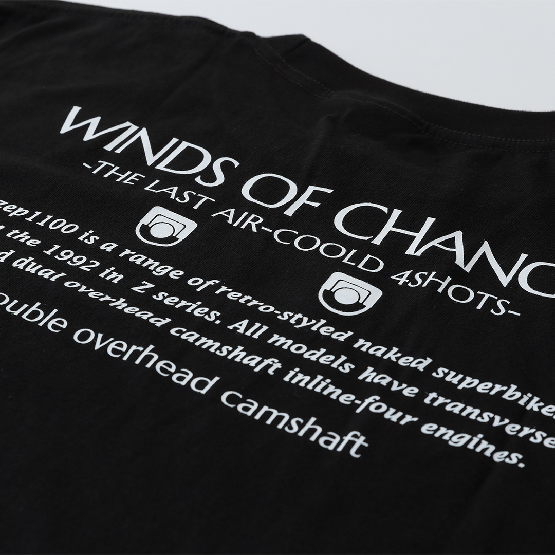 そんなゼファー1100乗りの方にピッタリのTシャツの第二弾です。背中の『WINDS OF CHANGE』はゼファー1100当時のカタログのキャッチコピー。ツーリングではもちろん、普段着使いも可能です!